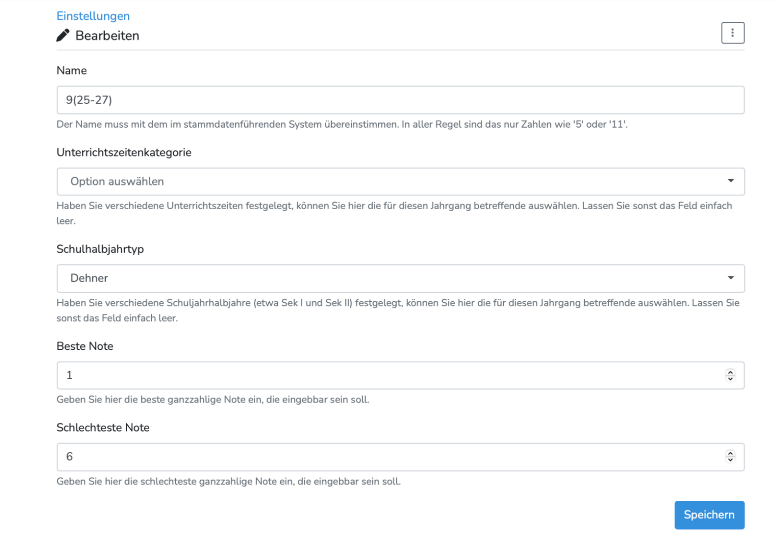 Haben Sie mehrere Jahrgänge, die sich über einen längeren Zeitraum strecken, müssen Sie für jeden Dehner-Jahrgang einen extra Halbjahrestypen anlegen. In diesem Beispiel müsste der Halbjahrestyp dann "Dehner 25-27" heißen.