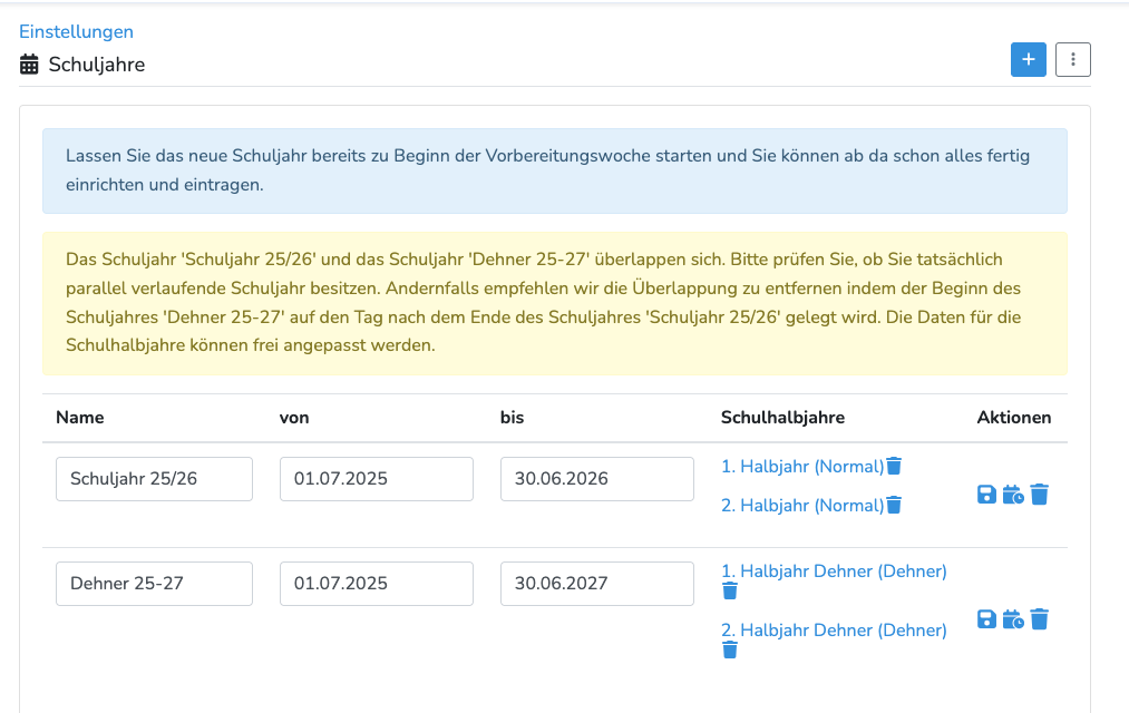 2. Legen Sie als nächstes das gestreckte Schuljahr an, welches beispielsweise einen Zeitraum von zwei Schuljahren hat und damit parallel zu den "normalen" Schuljahren liegt. Vergeben Sie hier bei den Schulhalbjahren einen separaten Typ (z.B. "Dehner" oder "LRS"). Es könnte dann wie folgt aussehen: