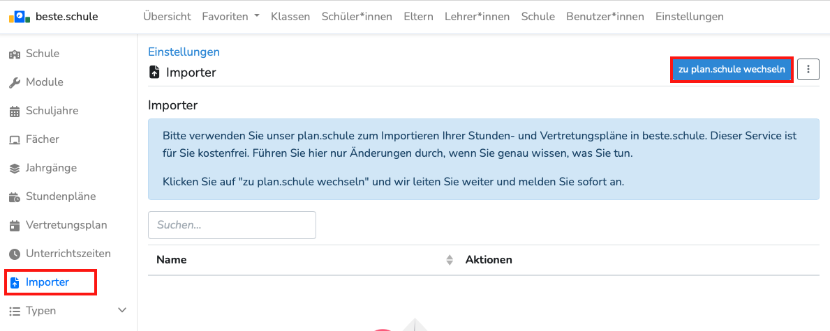 Klicken Sie in beste.schule links in der Navigationsleiste auf "Importer" und wählen Sie anschließend "zu plan.schule wechseln" aus: