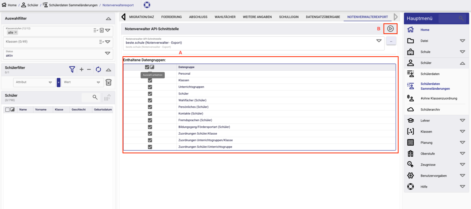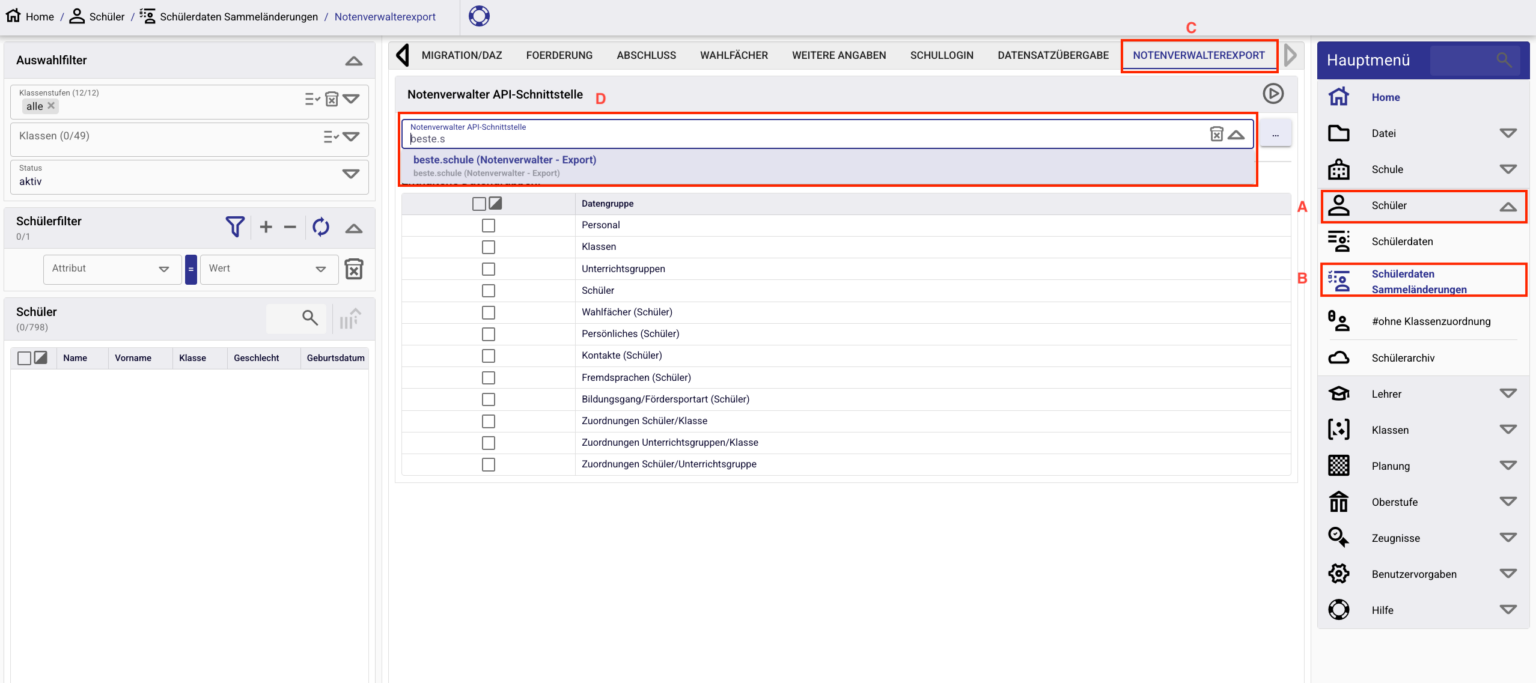 Klicken Sie unter "Schüler" (A) auf "Schülerdaten Sammeländerung" (B) und wählen Sie den Reiter "Notenverwalterexport" (C) aus. Wählen Sie abschließend im Auswahlmenü beste.schule als "Notenverwalter API-Schnittstelle" (D) aus.