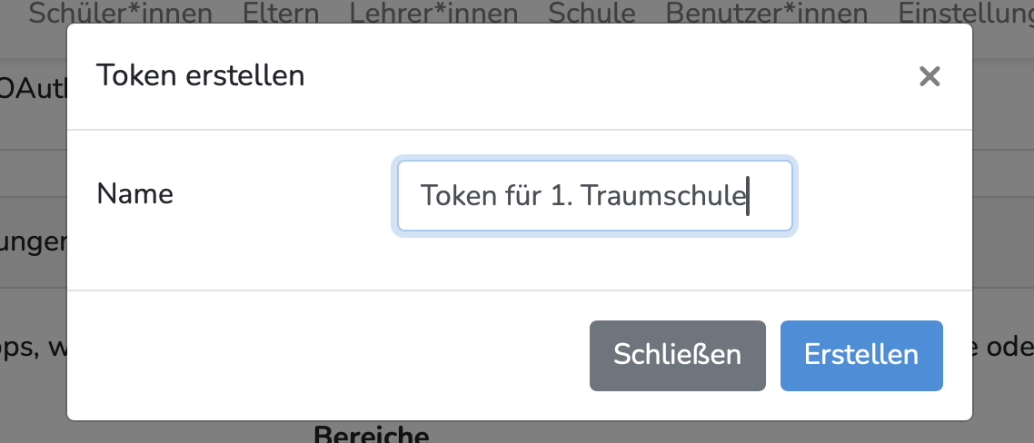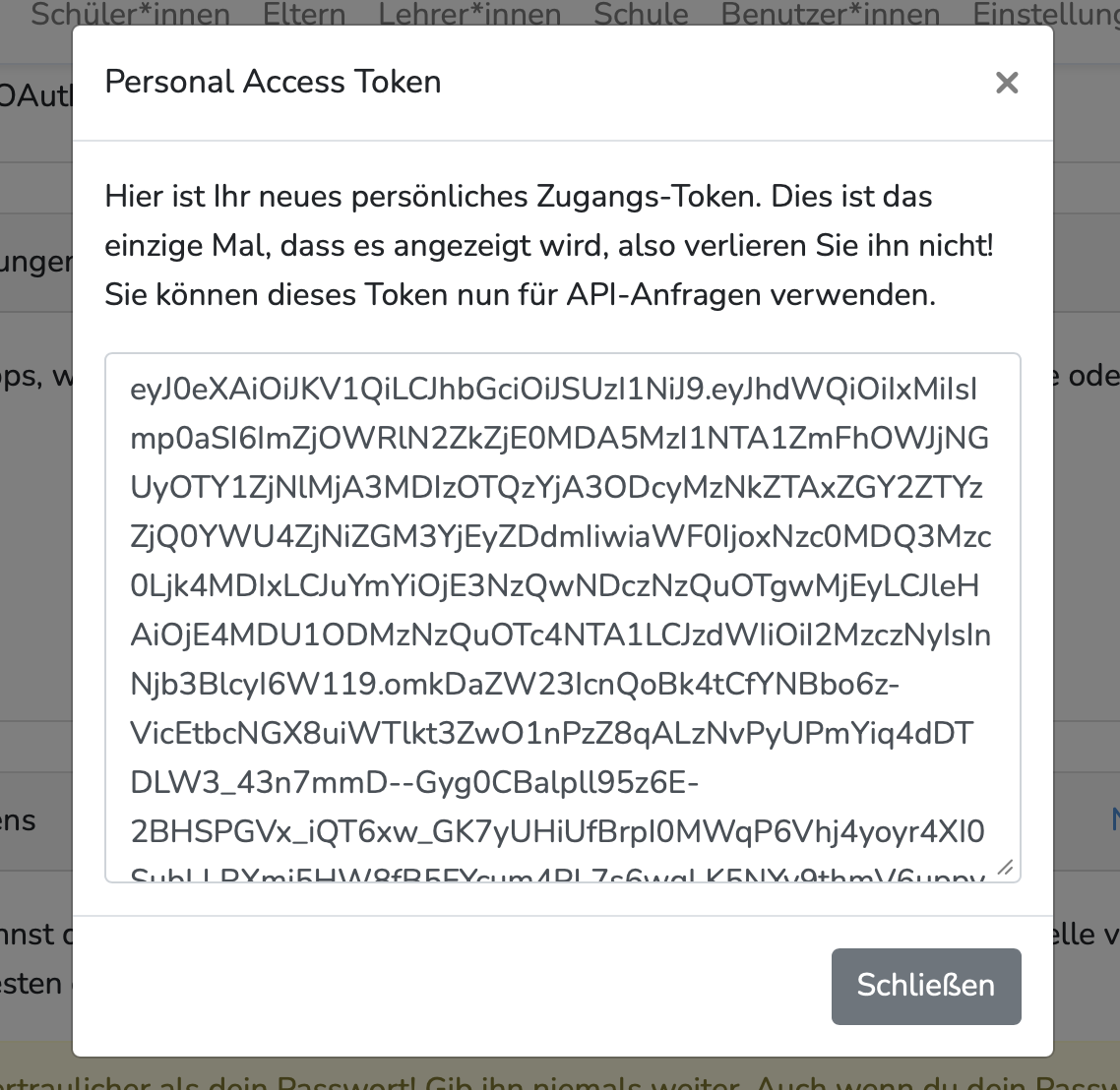 Nachdem Sie auf "Erstellen" klicken, erscheint der Token, welcher nur einmalig angezeigt wird. Lassen Sie das Fenster offen, da Sie den Token gleich im SaxSVS einfügen müssen.
