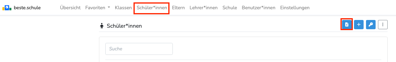 Öffnen Sie dazu in Ihrem beste.schule Admin-Account den Bereich „Schüler*innen“ über die obere Leiste und klicken Sie anschließend auf das Import-Symbol: