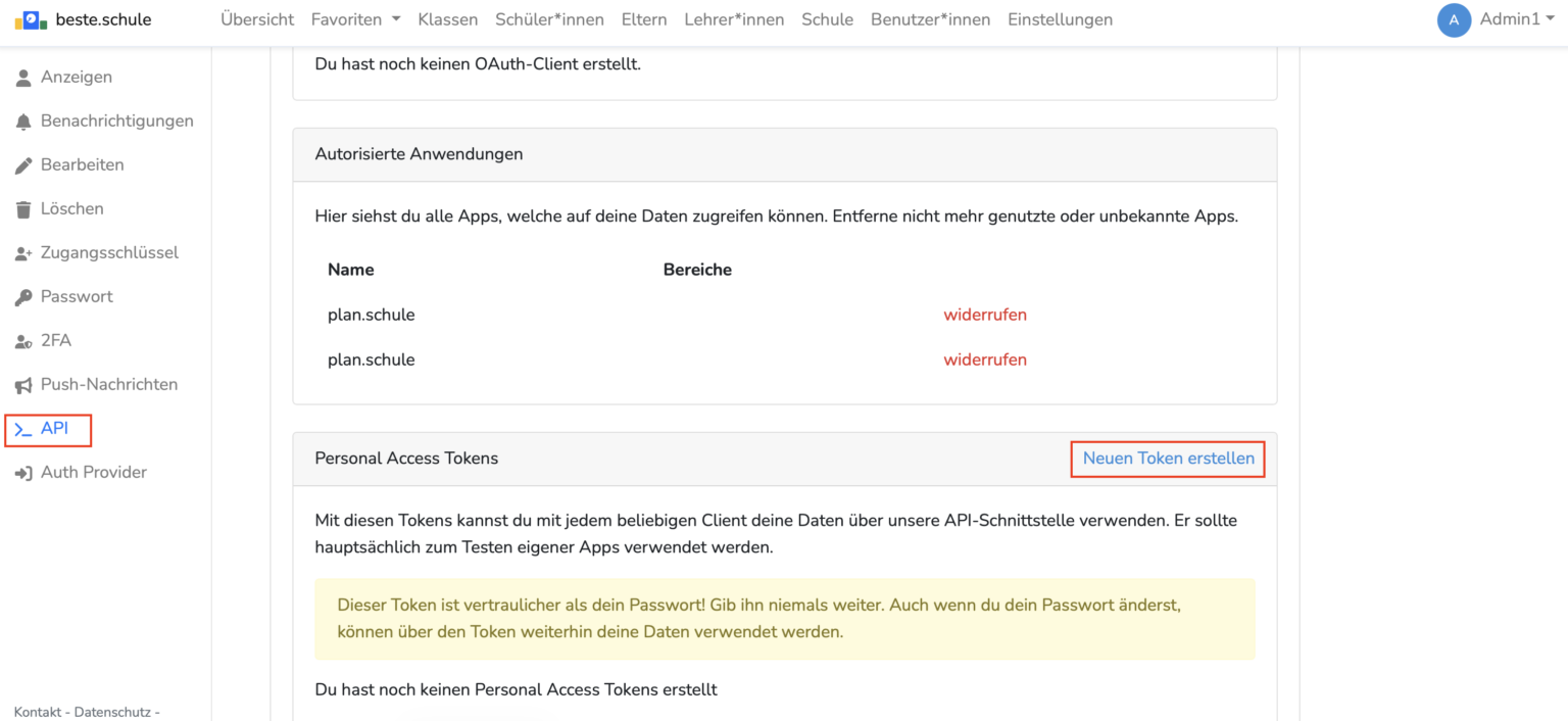 Klicken Sie anschließend links auf "API" und klicken Sie unter "Personal Access Tokens" auf "Neuen Token Erstellen".