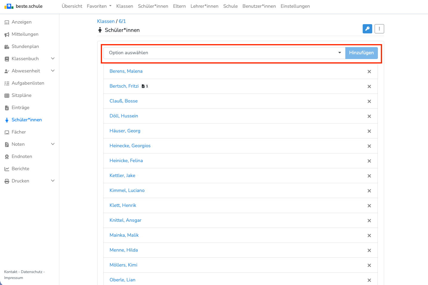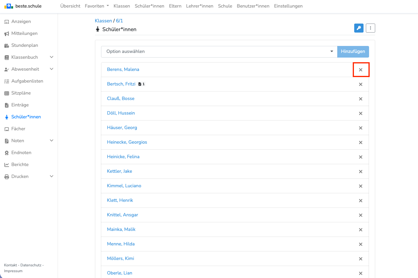 Um eine Person aus einer Klasse oder Gruppe zu entfernen, klicken Sie links auf das Kreuz: