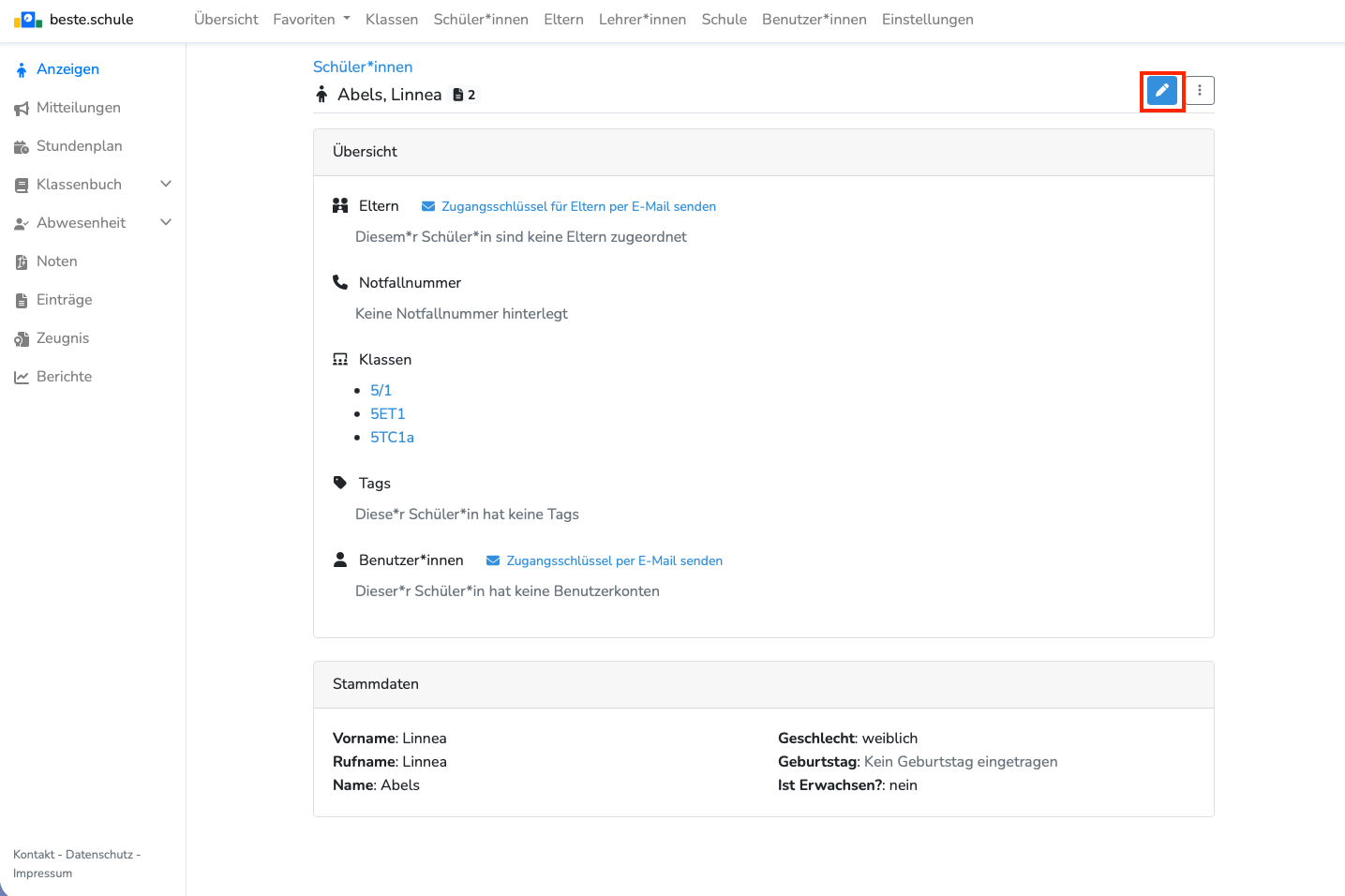 Suchen Sie zunächst die Person, die Sie löschen möchten aus der Liste der Schüler*innen aus. Nachdem Sie die Person ausgewählt haben, klicken Sie oben links auf den Stift: