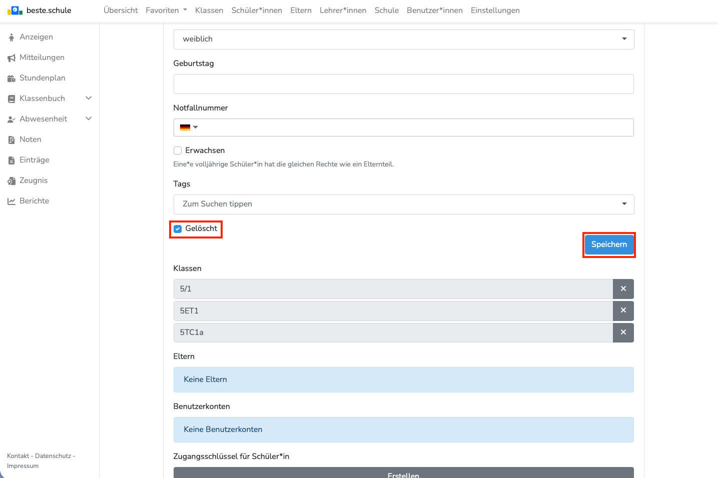 Die Person erscheint nun nicht mehr bei Lehrer*innen-Accounts. Sie als Admin können jedoch weiterhin auf die Person zugreifen und ggf. den "Gelöscht"-Button wieder rausnehmen.