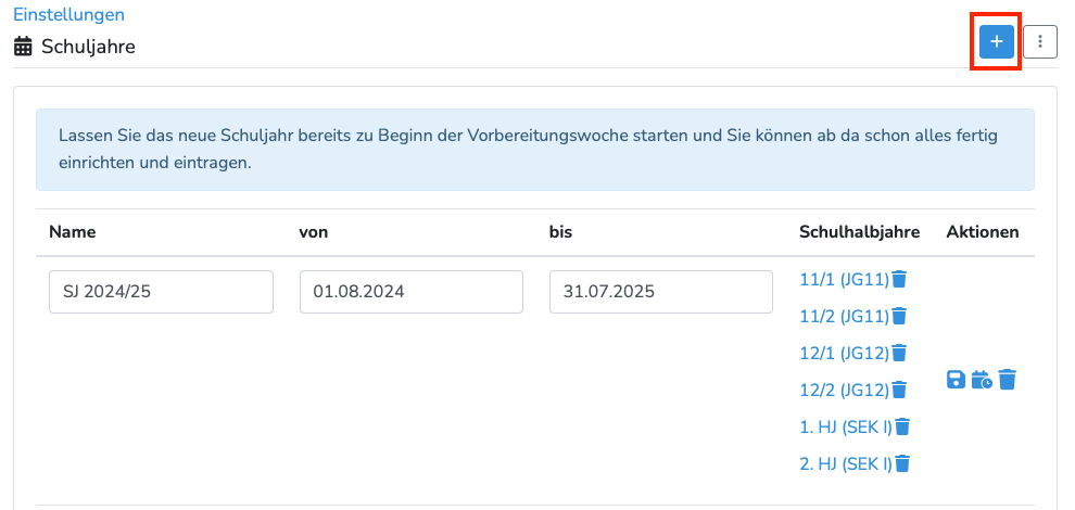 Legen Sie zunächst die “Rohdaten” des neuen Schuljahres an. Dafür klicken Sie auf “Schuljahre” im Admin-Panel und anschließend oben rechts auf das “+”.