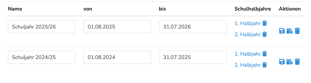 Anschließend erscheint eine neue Zeile für das neue Schuljahr. Vergeben Sie einen Namen (z.B. SJ 2025/26) und stellen Sie den Beginn und das Ende des gesamten Schuljahres ein. Klicken Sie zum Speichern auf das Disketten-Symbol. Beachten Sie beim Anlegen des Schuljahres unbedingt folgende Hinweise: