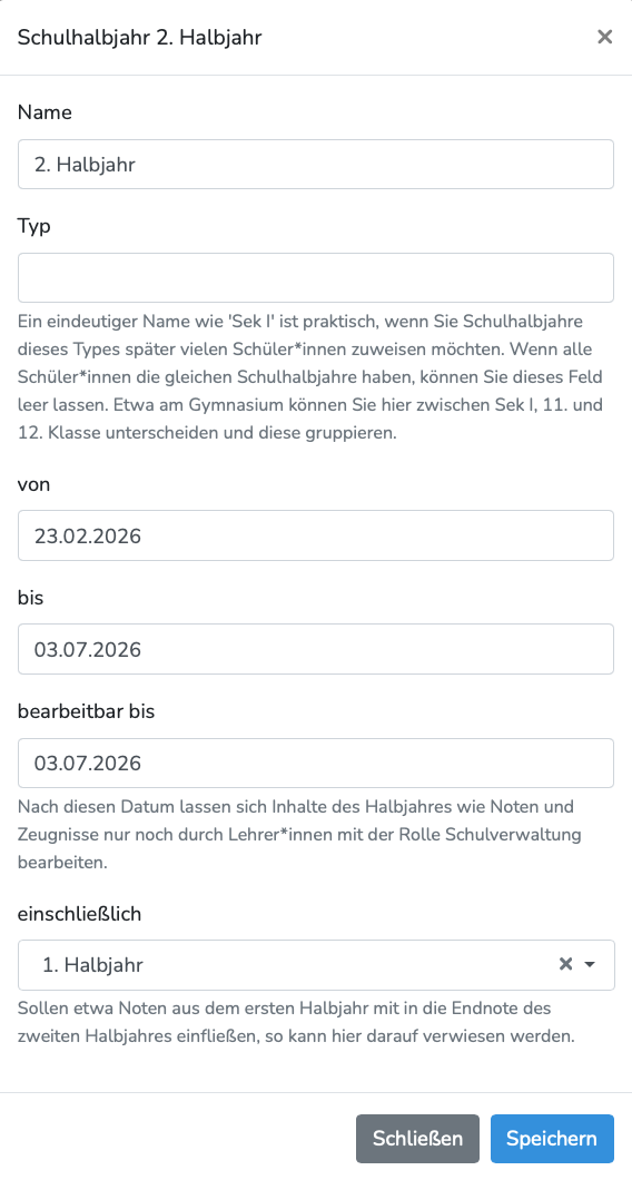 Wenn alle Ihre Klassen die gleiche Länge der Halbjahre haben, sollten Ihre Einstellungen so ähnlich aussehen: