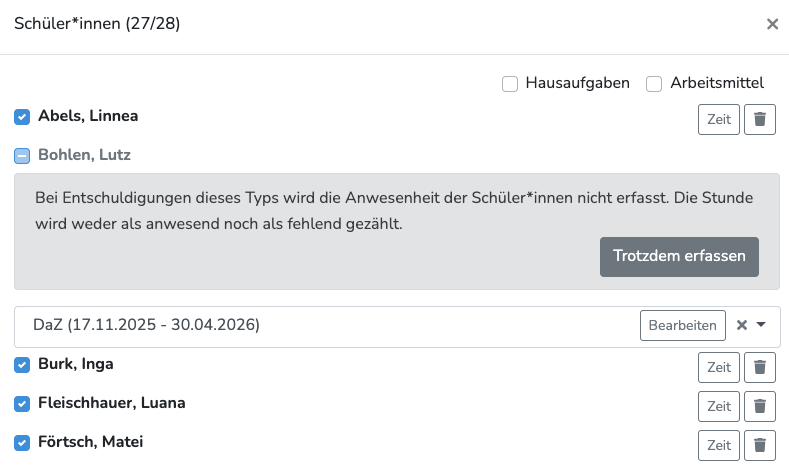 In den ausgewählten Fächern, wird die Anwesenheit nicht erfasst und Lehrkräfte sehen den Grund direkt bei der Kontrolle.